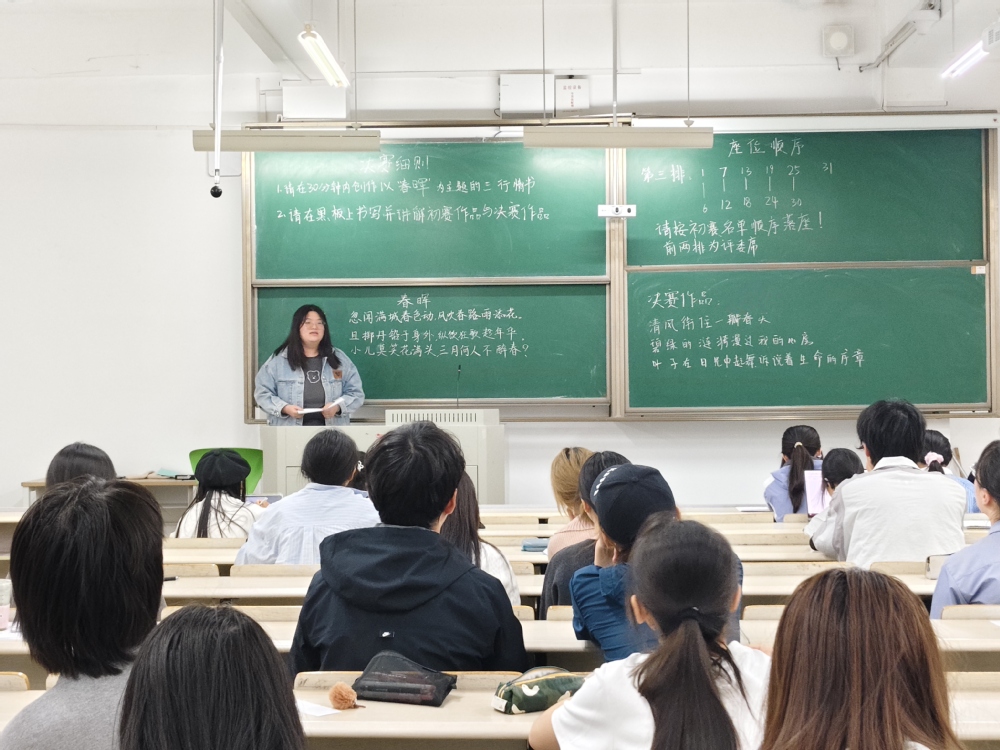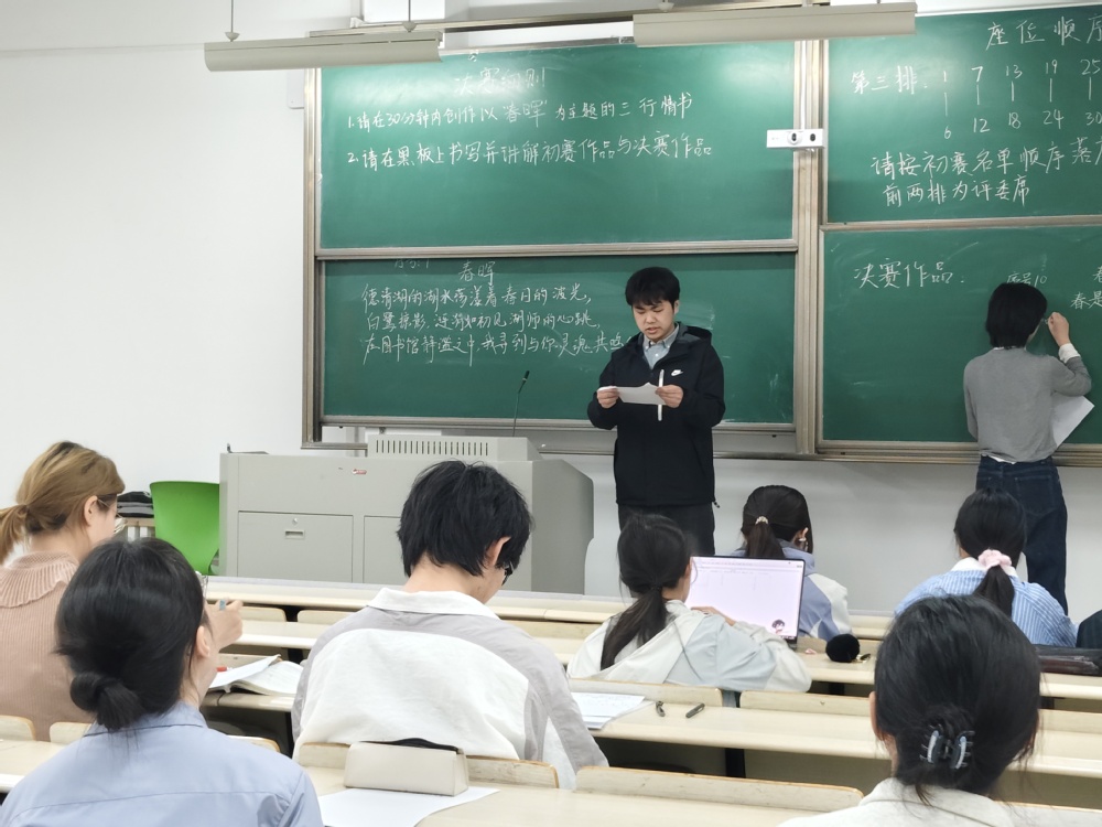 决赛于3月26日在32-101举行,参赛选手以“春晖”为主题写下三行诗句,从“忽闻满城春色动,风吹春路雨添花”到“她一路向前,肩上数十载春秋,化作春日的苍穹”,参赛选手挥动手中的粉笔,用笔墨深情刻画自己对春日的期待和热爱。虽只三行之短,可春日之情已溢于言表,当最后一缕诗香漫过讲台,创作热潮转化为动人的声光盛宴。在书写完毕后,参赛选手挨个携诗登台,向观众们朗诵并讲解创作缘由,活动现场妙趣横生。