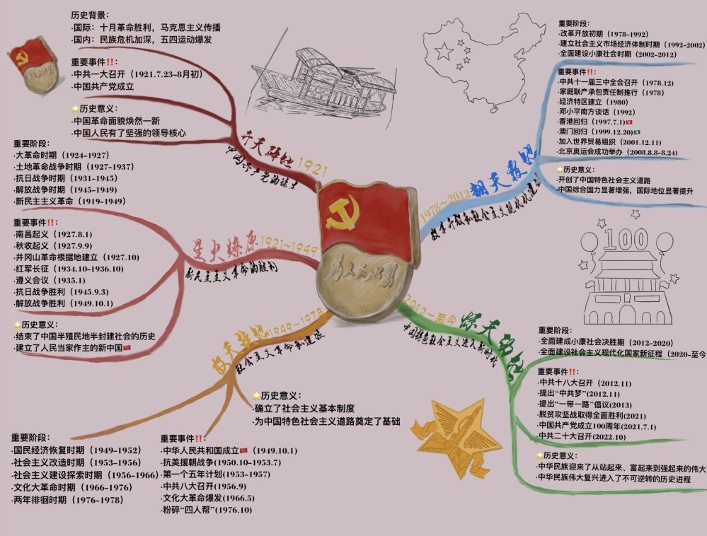 不同于传统党史学习课堂,本次活动将“学、思、创、行”深度融合,鼓励学生从“被动接受”转向“主动探索”。借助思维导图这一可视化工具,学生以笔尖梳理历史脉络,以色彩标注精神丰碑,以逻辑串联时代篇章。从五四运动到脱贫攻坚,从红船精神到新时代思想,学生在梳理过程中回顾党的光辉历程,从党史中汲取智慧和力量,进一步坚定理想信念,砥砺前行。