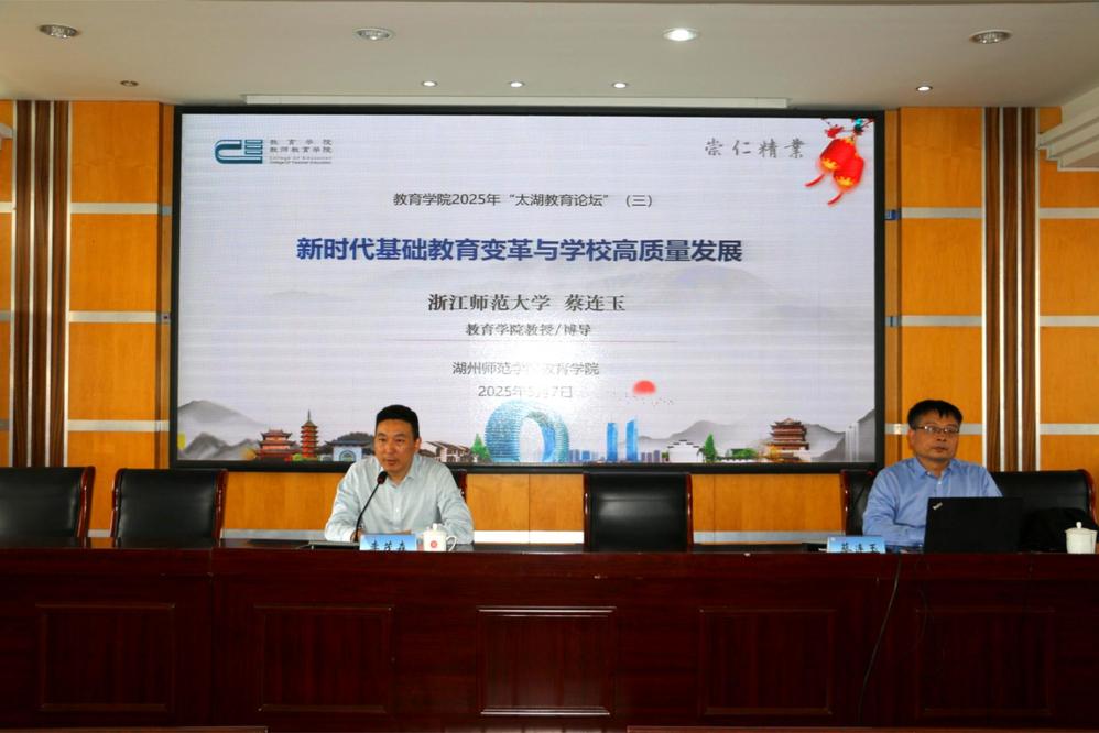 5月7日下午,教育学院2025年“太湖教育论坛(三)”在我院10幢512会议室顺利举办。本次论坛邀请浙江师范大学教育学院博士生导师蔡连玉教授,作题为“新时代基础教育背景变革与学校高质量发展”的专题讲座。论坛由教育学院执行院长李茂森主持,学院部分教师及研究生参加。