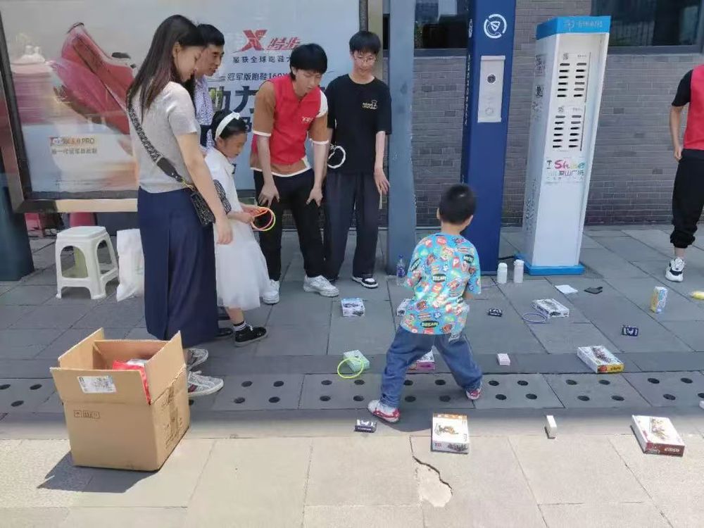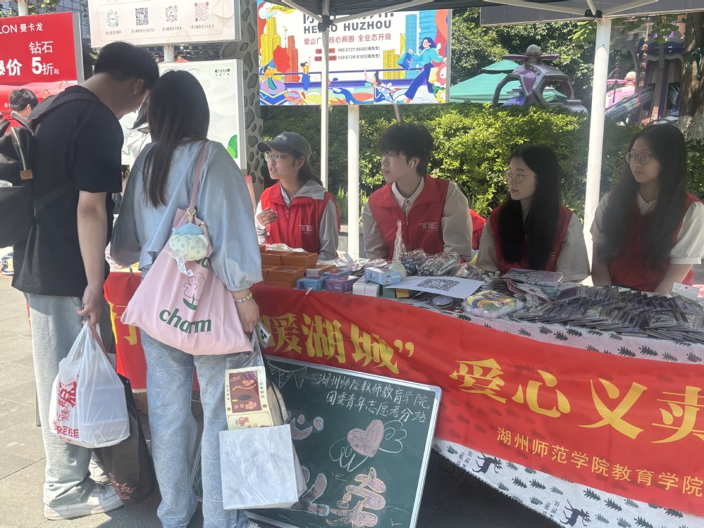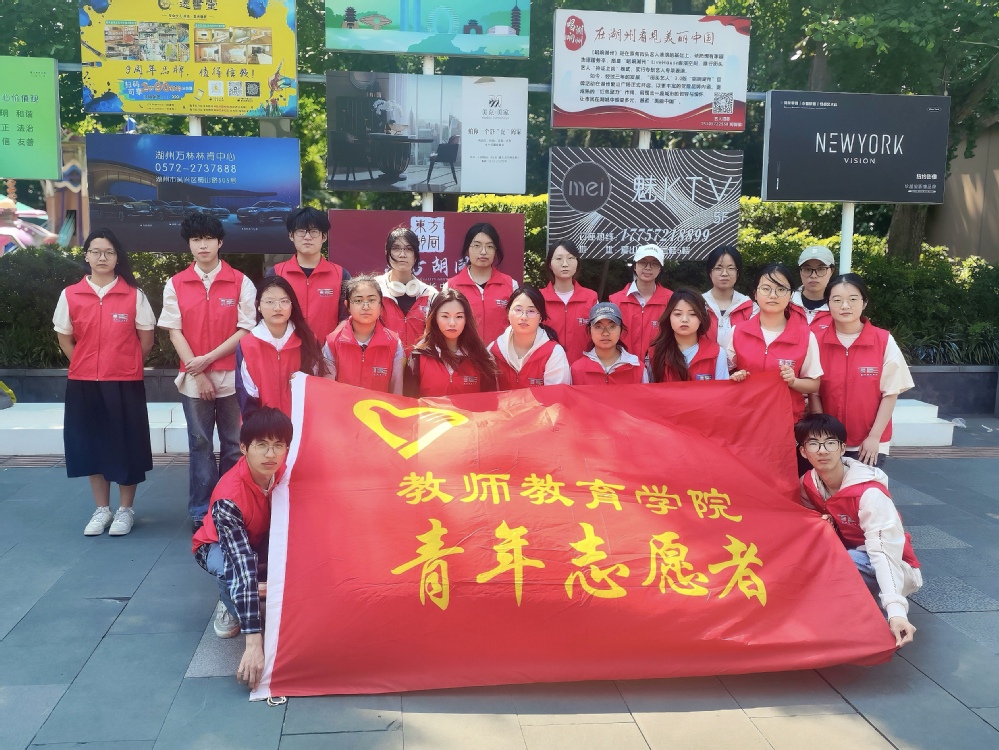 活动现场充满新意:缤纷的海报、整齐的物资、创意造型门与互动游戏相映成趣,火红的横幅在微风中轻舞。教育学院的学生志愿者们手捧募捐箱、分发倡议书,向路过的市民们介绍“走进教育第一线”志愿服务品牌、“织里陪伴家+”志愿服务项目,每一份善款都将化作爱心物资,温暖湖州随迁子女的心田。这群青年志愿者正以实际行动诠释责任担当,为共建“美丽湖州”贡献青春力量。