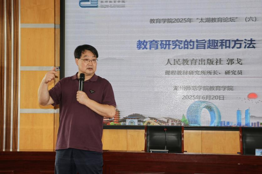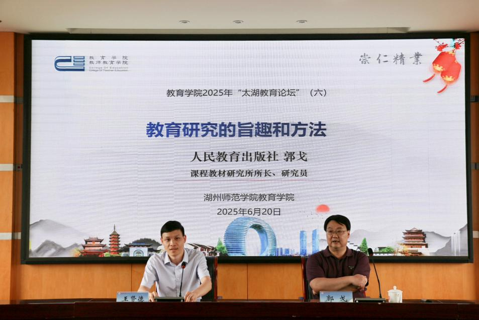 6月20日下午,教育学院2025年“太湖教育论坛(六)”在我院10幢512会议室顺利举办。本次论坛邀请人民教育出版社课程教材研究所所长、研究员郭戈,作题为“教育研究的旨趣和方法”的专题讲座。论坛由我院副院长王贤德主持。学院部分教师及研究生参加。