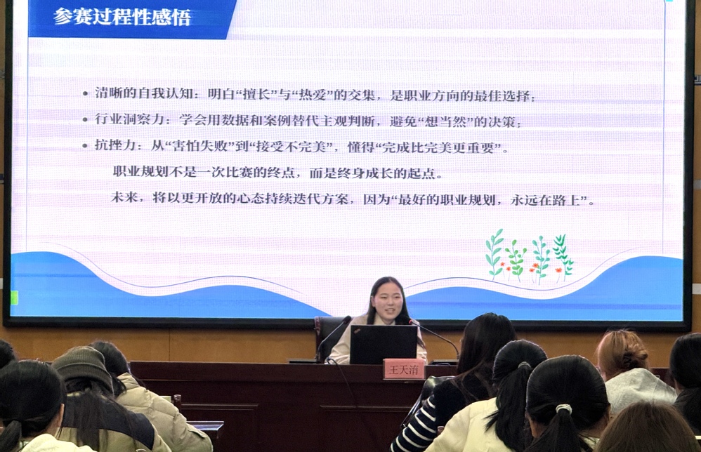 经济管理学院教师谭亭亭从“为什么参与职业规划大赛”到“如何打造优秀参赛作品”,系统讲解了职业探索思路与作品核心模块设计方法,如职业目标设定、路径规划、能力提升计划等,以专业视角为同学们指明备赛方向。