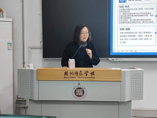 讲座伊始,主讲教师全面解析了试讲、说课、结构化问答及答辩等面试全流程,重点围绕着装礼仪、讲课仪态、评分标准与自我评价等核心要素展开细致讲解。报考方向上,教师建议重点关注两类岗位:一是小学全科教师,需具备多学科教学能力,在“双减”政策下就业优势突出;二是初中学科教师,可在小学编制岗位收紧形势下拓宽职业路径、增加就业机会。